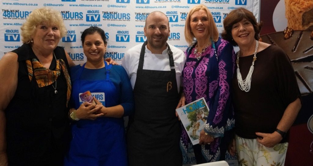Australian Masterchef Judge, George Calombaris was very much in demand at the Good Food and Wine Show that was held in Durban recently with Masterchef fans queuing to watch his show and to get a glimpse of his magic touch in the kitchen. He also hosted a small tea party on the 48HOURS TV stand, and over a cup of tea and Red Velvet Cake, chatted to Margaret and her Media team (Johan Schroeder who handles her SM and Glenda Thompson, Hirsch’s PR Consultant) about the show, his favourite appliances, and what he loves about Durban, the warmth of the people and bunny chows being some of the many things!