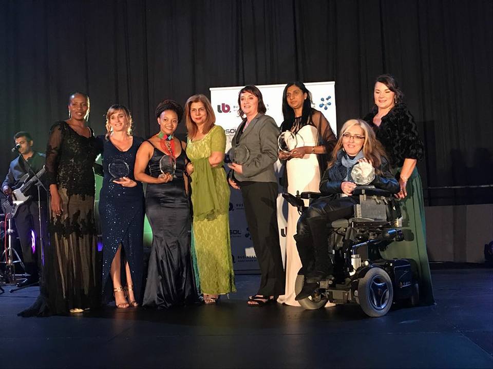 Get-U-Noticed recently nominated client, Lesa Bradshaw from Bradshaw Le Roux, for an award in the Professional sector of the prestigious BWASA (Business Women’s Association, South Africa) Awards in the Professional Category, and despite the fact that she was up against some stiff competition, Lesa, a Disability Integration Specialist, won the award. Lesa is pictured here – second from right – with other winners at the BWASA awards evening.